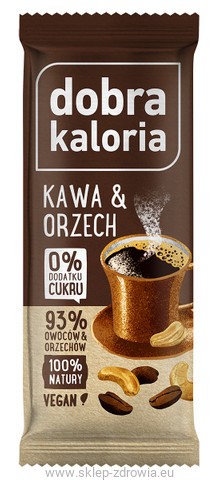 Składniki: Daktyle, chrupki zbożowe (mąka kukurydziana, mąka ryżowa), orzechy nerkowca (14%), kawa (5,1%). Może zawierać kawałki pestek owoców.
