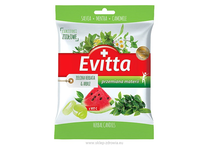 Evitta zielona herbata, arbuz, ziołowe cukierki bez cukru z witaminą C, smak zielonej herbaty i arbuza, 60 g.