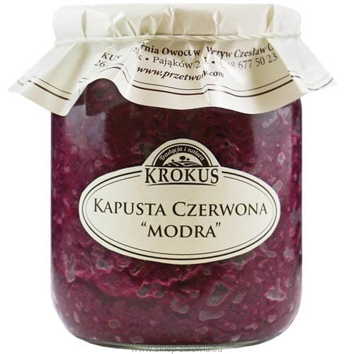 Nasza kapusta czerwona “modra” ma intensywny różowawy kolor. Nie zawiera powszechnie dodawanego octu. Rodzynki nadają jej delikatny słodki smak. Po otwarciu słoika unosi się przyjemny aromat. Paski kapusty, dość ciasno upakowane w słoju, są jędrne.
