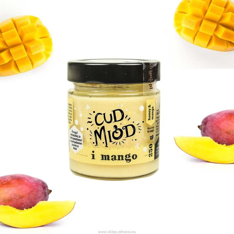 Cud miód i mango to kremowany miód wielokwiatowy z dodatkiem liofilizowanego mango.