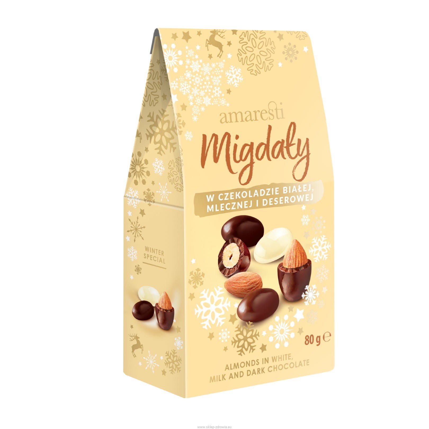 Migdały w czekoladzie białej, mlecznej i deserowej 80g Amaresti