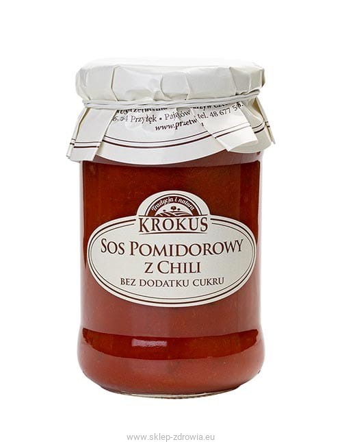 Sos pomidorowy z papryką chili produkukowany ze świeżych pomidorów, a nie z koncentratu. Pomidory gruntowe przecieramy przez sita, zagęszczamy odparowując wodę- nie dodajemy substancji zagęszczających. Dzięki temu sos nie zawiera glutenu. Do tak przygotowanej bazy dodajemy świeżą, przetartą paprykę chili, cebulę, czosnek i przyprawy (bazylię, pietruszkę, słodką paprykę i sól). Nasz sos nie zawiera dodatku cukru. Całość jest dosmakowana i gotowa do użycia od razu po otwarciu słoika. Produkt pasteryzowany.